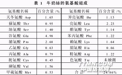 0 前言牛奶酪素蛋白與丙烯 接枝共聚后的化學(xué)纖維,一般簡稱為牛奶絲。丙烯 基的牛奶絲早期首先由日本東洋紡織株式會社于1969年研制成功[1,2],商品名為Chinon。近年來,上海正家牛奶絲科技有限公司也實現(xiàn)了牛奶絲的小批量生產(chǎn)[3,4],其原料有長絲和短纖之分,以后者為主。牛奶絲含有多種氨基酸,具有良好的親膚性和牛奶的清香,其面料具有真絲般光澤和良好的吸濕導(dǎo)濕性,質(zhì)地輕薄、手感柔軟滑爽,因而是一種具有良好發(fā)展?jié)摿Φ男滦屠w維。就化學(xué)組分而言,牛奶絲中除含有牛奶酪素蛋白和聚丙烯 組分外,還含有磺酸基(因為在接枝共聚時添加了磺酸基單體),由SGS CSTC標準技術(shù)服務(wù)有限公司測定的牛奶絲(上海正家牛奶絲科技有限公司)氨基酸組成見表1。