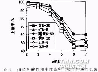圖4中,溫度對酸性染料上染率的影響因染料不同而存在較大差別。紅N B的上染率受溫度影響較小,而黃N 3R和藏青N 5R受影響較大,且藏青N 5R的上染率在50~70℃階段受影響更大。三只中性染料的上染率受溫度的影響均很大,其上染率隨溫度升高而逐漸增加,且與藏青N 5R一樣,在50~70℃階段受溫度的影響更大。 染色溫度對染色的影響是多方面的。溫度升高,有利于提高纖維的膨化程度,加強染料的擴散動能,降低染料的聚集度,以利于染料上染。藏青N 5R分子量高,兩個磺酸基在分子的兩側(cè),在染液中易于聚集。中性染料的親水性低,分子量高,更加容易聚集。對這些聚集度大、分子量高,且擴散需要更高能量的染料而言,升高染色溫度有利于染料上染,提高上染率。