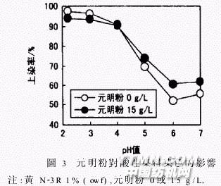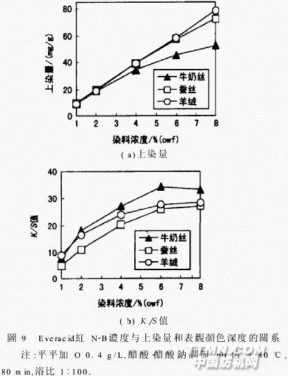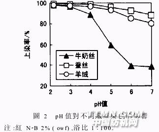 圖2中,牛奶絲染色的pH值敏感性大于蠶絲和羊絨。牛奶絲必須在較低