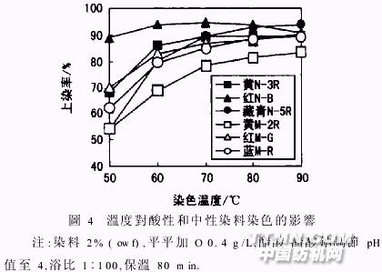 由圖3可知,當(dāng)染液pH值為4時,添加元明粉基本不影響酸性染料上染率;當(dāng)染液pH值小于4時,添加元明粉降低了染料的上染量,起緩染作用;在pH值大于4時,添加元明粉提高了染料的上染量,起促染作用。故粗略地認為牛奶絲的等電點約為4。 2.3 溫度對酸性和中性染料染色的影響 在不同溫度下進行酸性和中性染料對牛奶絲的染色試驗,結(jié)果見圖4。