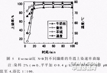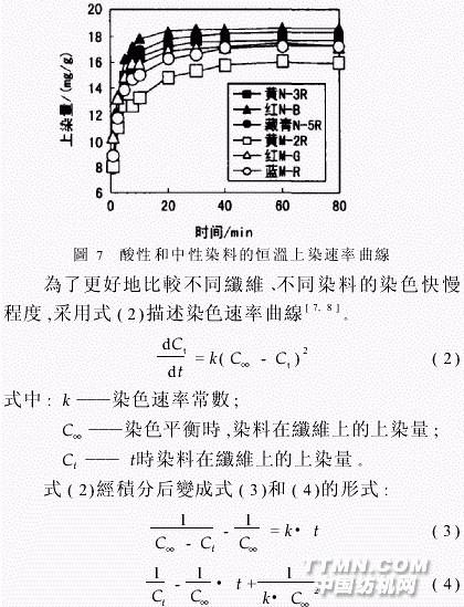 由圖5可知,酸性染料對牛奶絲和蠶絲的上染趨勢相同,即初染率很高,在低溫下短時間內(nèi)就達到了較高的上染率。羊絨表面存在鱗片層,低溫下纖維膨潤性差,染料不易向纖維內(nèi)部擴散,故酸性染料的初染率較低。在染色初始階段,染料的上染通常以吸附為主,擴散不多。但是,如果纖維表面積大且結(jié)構(gòu)較疏松,則染料的初始吸附量會較高,也會存在一定程度的擴散。牛奶絲纖維較細、表面積大,且牛奶絲酪素蛋白主要分布于無定形區(qū)[5,6],這使得低溫下染料在牛奶絲上的吸附量較大,并在纖維內(nèi)發(fā)生一定程度的擴散,從而表現(xiàn)出較高的初染速率。應(yīng)采取適當(dāng)?shù)拇胧┙档团D探z的初染速率,以提高勻染性。圖6為Everacid紅N B對牛奶絲、蠶絲和羊絨的恒溫上染速率曲線。圖7為三只酸性染料和三只中性染料對牛奶絲的恒溫上染速率曲線,其縱坐標是根據(jù)上染率計算的染料在纖維上的上染量Ct。.jpg)
