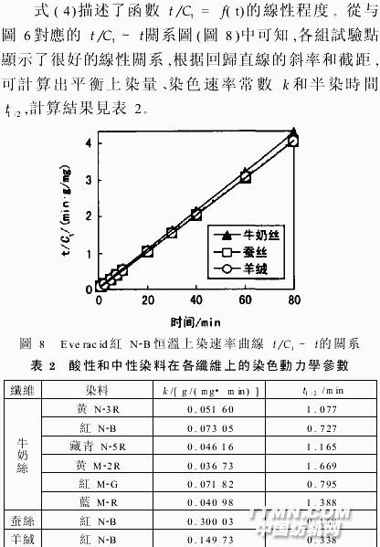 由表2可知,在80℃下,與蠶絲和羊絨染色相比,Everacid紅N B對牛奶絲的染色速率常數(shù)較小,半染時間較長,說明酸性染料對牛奶絲的上染速度慢于對蠶絲和羊絨的上染速度。這與圖5中的低溫下紅N B對牛奶絲的上染速度較快是不同的。在80℃下,牛奶絲聚丙烯 組分的物理結(jié)構(gòu),可能會因大分子鏈段運動加劇而發(fā)生變化,并導(dǎo)致牛奶絲酪素蛋白大分子之間的空隙或酪素蛋白分子與聚丙烯 大分子的空隙變小。由于酸性染料系染著于酪素蛋白處,故其上染速度會受到影響。由于牛奶絲化學(xué)組成的特殊性,以及聚丙烯 在一定溫度下分子鏈段運動加劇可能對染色性能帶來特殊的影響,有待進一步探討。 比較表2中不同染料在牛奶絲上的染色動力學(xué)參數(shù),中性染料因分子量和分子尺寸大于酸性染料,故其半染時間長于酸