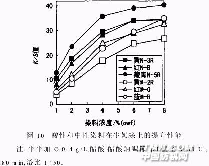 由圖10知,在染料濃度1%~6%(owf)范圍內(nèi),牛奶絲的表觀顏色深度均隨著染料濃度增加而逐漸增大說明酸性和中性染料在牛奶絲上均具有很好的顯色性和提升性。染料濃度高于6%后,中性染料表現(xiàn)出更好的提升性能。高濃度下,中性染料在牛奶絲上的吸附屬Langmuir和Nernst二元吸附。Langmuir吸附具有飽