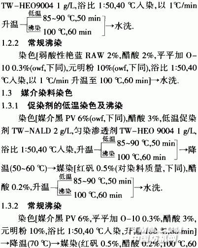 1 試驗1.1 材料與儀器織物:精紡羊毛機織熟坯;藥品:弱酸性艷藍RAW、媒介黑PV(寧波利華染料廠)、元明粉、醋酸、平平加0—10、紅礬、肥皂、低溫促染劑TW一NALD、勻染滲透劑 TW一HEO 9004(煙臺市惠中化工有限公司).儀器"GretagMacbeth Color—Eye 7000A型測色儀、摩擦牢度儀(溫州大榮紡織標準儀器廠)、FA 2004型電子天平、HHS型恒溫水浴鍋.1.2 弱酸性染料染色1.2.1 促染劑的低溫染色及沸染染色弱酸性艷藍RAW 2%(owf,下同),醋酸2%(owf,下同),低溫促染劑TW -ALD 2 g/L,勻染滲透劑