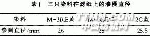 1 小樣實(shí)驗(yàn)1.1 準(zhǔn)備工作染料:100%紅M-3BE,100%黃M一3RE,100%藍(lán)2G織物:60~60/20~20純棉半制品設(shè)備:臺(tái)灣產(chǎn)的Rapid小樣機(jī),CS101—2A型電熱鼓風(fēng)干燥箱1.2 染料配伍性實(shí)驗(yàn)用微量移液管將染料(5 g/L)定量,定距離,垂直滴在濾紙上,讓染液在濾紙上自然滲化,測(cè)定各染料滲圈直徑大小(表1)。