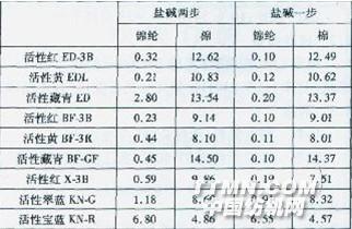 染液pH值=6.0 預處理時,酸性固色劑TF-506在酸性條件下與錦綸纖維上的NH4+形成鹽式鍵結(jié)合,使直接混紡染料對錦綸的沾色大大減小。同時,由于預處理后,直接混紡染料對錦綸的上染減小,染浴中直接混紡染料的相對濃度較高,因此,棉得色明顯高于未經(jīng)處理的織物。 直接混紡/酸陛染料一浴法染色,若先經(jīng)酸性固色劑TF-506預處理,再在弱酸性(pH值=6.0)條件下染色,錦綸和棉都可獲得較高的得色,也可解決直接混紡/酸性染料一浴染色時的相互沾色問題,取得良好的雙色效果。需要指出的是,酸性固色劑TF-506應先對織物進行預處理,若與染料同時加入,對錦綸的防沾效果并不理想;預處理對酸性染料在錦綸上的得色略有影響,因此需控制好酸性固色劑TF-506的用量,一般應控制在1%(owf)以內(nèi)。2.5鹽堿加入方式對活性染料染色K/S值的影響表5不同鹽堿加入方式對活性染料錦綸和棉K/S值的影響