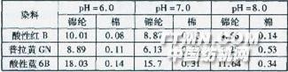染液pH值=6.0 表2中,經(jīng)過酸性固色劑TF-506預(yù)處理,酸性染料在錦綸上的得色略有下降,但明顯高于酸性染料在中性和堿性條件下得色,而且酸眭染料對棉的沾色小。2.3染液pH值對直接混紡染料染色K/S值的影響表3不同pH值直接混紡染料染錦綸和棉上的K/S值