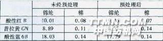 從表1知,當(dāng)染液pH值=6時,酸性染料在錦綸上的得色很高,而且對棉的沾色?。辉谥行詶l件下,酸性染料在錦綸上得色下降,對棉的沾色有所增大;當(dāng)染液pH值=8時,酸性染料在錦綸上的得色大大下降,對棉的沾色較大。2.2預(yù)處理對酸性染料染色K/S值的影響表2預(yù)處理前后酸性染料染錦綸和棉上的K/S值