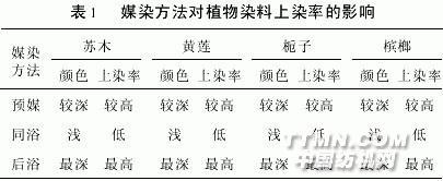 由表1可見,采用后媒染色法效果最好,得色最深,上染率最高,故本研究采用后媒染色法.2.4染料提取液最大吸收波長 由表2可見,提取色素方法不同,所得染料提取液的最大吸收波長不同,即色素的色光不同,這是因為色素成分在水與乙醇中的溶解度不同所致.