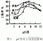 由圖1、圖2、圖3和圖4可見,升高反應溫度,染料的溶解度增加,纖維膨脹加劇,染料在苧麻織物上的色澤加深,上染率高.蘇木、檳榔、黃蓮、梔子在90℃時上染率較高.90℃時,上染時間超過60min后,上染率幾乎不改變.因此,選擇反應溫度90℃、上染時間60min為宜.2.5.2pH值上染率的影響