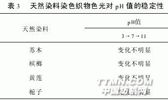 由圖6可見,稀土加入后能提高染料的上染率.這是因為稀土離子的外圍電子特殊構形使得它極易與含孤對電子的基團形成絡合物,在上染時形成植物染料-稀土-纖維的絡合結構,從而增加了染料的上染率,但是,當稀土濃度達到一個定值以上時,上染率基本保持不變,可見植物-稀土-纖維之間的結合由一定的絡合比,因而可達到一個飽和值.實驗證明,蘇木、檳榔、黃蓮、梔子的最佳稀土用量分別為0.5、0.8、0.4、1.0g/L.2.6染色織物牢度測試2.6.1pH對稀土媒染織物色光穩(wěn)定性的影響 由表3可見,蘇木、檳榔、黃蓮、梔子的稀土染色織物對pH值有較高的色光穩(wěn)定性,這對拓展稀土媒染劑在植物染料染色中的應用有十分重要的意義.