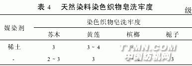 表4可見,加入稀土后,能提高織物染料的染色牢度,尤其以梔子加入稀土后染色牢度提高最大.3結論3.1植物染料的色素提取即可用水煮法,也可用乙醇萃取法.3.2用稀土作為媒染劑,能提高染料的上染率,改善染色牢度.3.3苧麻一次性上染率較差,故采用多次媒染方式3.4本研究對棉、真絲、毛進行了實驗,植物染料同樣可用于這類纖維織物的染色.3.5用稀土作為天然植物染料的媒染劑,在綠色產品的開發(fā)應用中有廣闊的市場.
