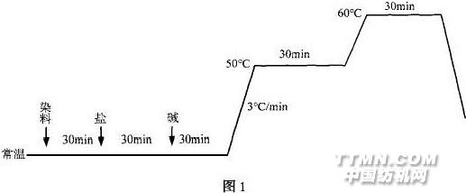 1 前言 活性染料以其優(yōu)良的使用性能在針織物印染中有較廣泛的應(yīng)用,而乙烯砜類染料(KN 型) 在各印染廠使用更為普遍。但此類染料的反應(yīng)性和擴(kuò)散性較均三嗪染料(X型、K型)為中等,而通常的染色工藝為中溫染色、固色,中溫加堿劑,這樣在大樣生產(chǎn)中極易造成條花和白斑,尤其是深藍(lán)、軍藍(lán)等深濃色,并且染出的坯布手感粗糙、顏色灰暗。本廠在近幾年的染色中,對(duì)KN 型染料在常溫機(jī)上染棉針織物的染色工藝,進(jìn)行了不斷地實(shí)驗(yàn),對(duì)此,終于成功地摸索出一套成熟的染色工藝。2 染色機(jī)理 乙烯砜類活性染料( KN型) ,通常以較穩(wěn)定的β- 羥基乙砜硫酸酯形式存在,染色時(shí)在堿性介質(zhì)中先脫去硫酸酯基,形成活潑的乙烯砜基后,再和纖維素發(fā)生親核加成反應(yīng)。3 染色過(guò)程3.1 工藝流程 坯布進(jìn)缸→漂底→水洗→熱洗→水洗→染、固色→水洗→酸洗→水洗→皂煮→水洗→柔軟出布。3.2 工藝曲線(見圖1)