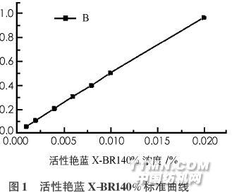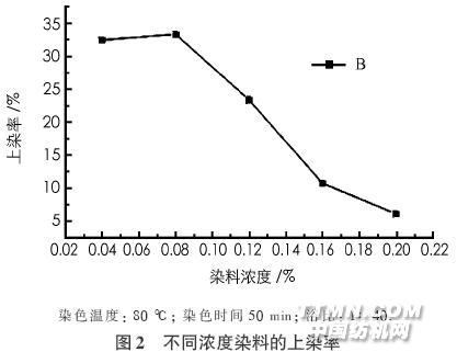 用TU-1810紫外可見分光光度計對活性艷藍XBR140%的溶液進行光譜測量,其最大吸收峰在597nm.標準曲線如圖1所示,線性回歸得:Y =48.778+0.0153,R2=0.9996,線性相關(guān)性很好. 2.2 不同濃度染料的上染率