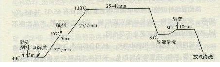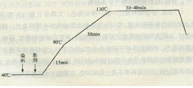 滌棉混紡針織物以緯編單面織物居多,混紡比有65/35、35/65、50/50等。交織針織物一般是緯編雙面織物。滌棉比例不同,產(chǎn)品性能不同,適宜的染色方法和工藝也不盡相同。滌棉混紡(交織)針織物中滌綸一般用分散染料高溫高壓染色,棉通常采用直接、活性、還原等染料染色。選用兩類(lèi)染料對(duì)滌棉混紡(交織)織物染色時(shí),不但要注意減少相互沾色,還要求兩類(lèi)染料的染色牢度接近。相容性好的染料,可采用一浴法染色,相容性差的染料,采用二浴法染色。具體染色方法可根據(jù)色澤要求、染化料情況等因素確定。(一)一浴一步法染色1.分散染料一浴一步法染色 滌棉混紡針織物的淺色產(chǎn)品或滌綸比例較高的產(chǎn)品,可只用分散染料對(duì)滌綸染色,無(wú)需套染棉,工藝簡(jiǎn)單。染色采用高溫高壓法,染色后進(jìn)行還原清洗,去除沾色和浮色,染色處方和工藝參照分散染料染滌綸針織物。2.分散/活性染料一浴一步法染色(1)分散脂性染料堿性一浴一步法染色。大部分K型、KN型、KD型、M型活性染料耐高溫,可與分散染料在弱堿性浴中同浴染色。堿性染色時(shí),必須選用耐堿性能良好的分散染料,否則會(huì)被堿劑破壞,影響上染率和色光。在堿性條件下同浴染色時(shí),活性染料上染纖維素纖維并和纖維素纖維反應(yīng)固色是在升溫過(guò)程中進(jìn)行的,因此必須控制好升溫速度,如果升溫過(guò)陜,活性染料來(lái)不及上染和固色,在高溫下水解速率增加。工藝流程:分散/活性同浴染色→水洗→皂洗→水洗染色配方:分散染料x(chóng)%,活性染料y%,硫酸鈉30—60g/L,碳酸鈉0.1—4g/L,擴(kuò)散劑NNO 0.5一lg/L,平平加O 0.3—0.6g/L,防染鹽SO一0.5g/L。升溫曲線: