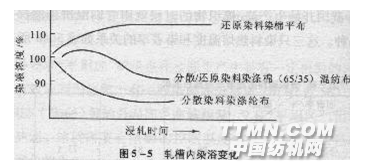 滌/棉織物熱熔染色浸軋時需要注意的問題有: 浸軋染液的方式為一浸一軋即可,這樣能保證染浴比較新鮮而且容易控制。如用二浸二軋,優(yōu)點是染液滲透較好。 軋槽的液量要少,新舊交換快,并可減少染料沉降。軋液溫度以室溫為宜。溫度偏高時,一部分分散染料會發(fā)生凝聚現(xiàn)象,如分散藍GR真。開車后軋槽內(nèi)染浴要發(fā)生變化,如圖5—5所示。