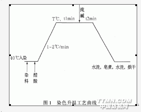 上染百分率低,國內(nèi)試制了一類具有β-羥基乙烯砜暫溶性基團的活性分散染料,其染料母體中無水溶性基團,染色如用普通活性染料上染,經(jīng)堿液處理后,脫去硫酸酯基轉(zhuǎn)變成不溶于水的乙烯砜基,此時水溶性很小,可像分散染料一樣上染纖維,同時乙烯砜基可與纖維上的氨基發(fā)生共價結(jié)合.1.2 實驗儀器與試劑活性黃M-3RE(宜興)、活性深藍(lán)M-2GE(宜興)、活性艷紅M-3BE(宜興)、元明粉、純堿、醋酸;恒溫水浴鍋、玻棒、200ml容量瓶、100ml燒杯、量筒、移液管、洗耳球、溫度計、電子天平、電腦測色配色儀、pH測試儀.1.3 活性染料上染錦綸染色工藝1.3.1 染色處方和工藝條件活性染料(對布重4%) xg/l純堿yg/l元明粉20g/l醋酸zg/l浴比1∶501.3.2 染色工藝曲線(圖1)