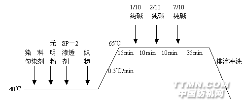 ③染色后處理:70℃×10min水洗→90℃×15min皂洗→80℃×10min水洗→50℃×10min水洗→冷水沖洗→脫水(軋水)→烘干④純堿用量比較