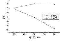 | (a)不同改性劑EP濃度和溫度對織物表觀深度的影響(改性時(shí)間5Omin) | (b)不同改性時(shí)間和溫度對織物表觀深度的影響(改性劑EP濃度 |