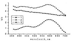 從圖6可以看出,碳黑和分散染料同時(shí)上染滌綸時(shí)上染率略有下降,這說明碳黑和分散染料具有較好的染色相容性,因此可以用不同顏色的分散染料來調(diào)整色光,另外從圖6還可以看出,碳黑染色織物對可見光的吸收為廣譜吸收,無最大吸收波長,而且表觀顏色深度明顯高于分散染料染色織物,這也證實(shí)了納米碳黑的著色力強(qiáng),染深性好,從而可解決滌綸染不黑的難題。