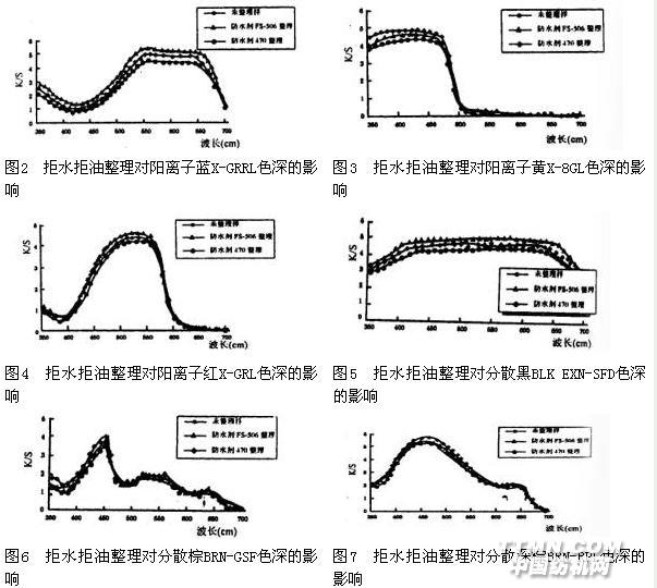 將普通滌綸和陽(yáng)離子可染滌綸的染色織物分別用防水劑FS-506和防水劑470按它們的優(yōu)化工藝條件進(jìn)行整理,然后用測(cè)色配色儀測(cè)定織物整理前后的表觀色深變化情況,結(jié)果見圖2-圖7及表2。