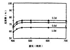 每根纖維表面都有一定數(shù)量的反射光,同一種纖維的反射率與纖度有關(guān),如滌綸纖維不同纖度時的反射率如圖2所示。這部分反射光,可能與染色無關(guān),而與纖度的比表面有關(guān)??墒牵w維染色后的折射光僅取于由纖維內(nèi)部重新回返到外部的折射光,其色相和色澤深淺,則取決于由表面直接反射光與由染色纖維內(nèi)部回返到外部的折射光之間關(guān)系。具有很大表面反射光的細(xì)旦或超細(xì)旦纖維,比用同樣數(shù)量染料染色的細(xì)旦纖維的色澤要淺得多。為使直接的反射光及由染色纖維內(nèi)部回返的折射光之間的關(guān)系,有利于增加表面色澤深度,則要求由染色纖維內(nèi)部回返的折射光盡可能地少,則要增加纖維內(nèi)部染科濃度才能實現(xiàn)。然而纖維纖度愈細(xì),則表面反射光愈大,以致要染深色尤為困難。其次,除纖維的直徑外,纖維的截面形狀、消光程度以及加工紗線支數(shù)等都會影響其視覺深度。