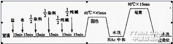 莫代爾針織布一般采用活性染料進行染色。莫代爾纖維對染料助劑比較敏感,而且對活性染料的親和能力很強,染料一旦上染就不易移染,很容易產(chǎn)生色花和色斑??刹捎萌棿胧﹣斫鉀Q上述難點:第一項是在染缸中先加適量的精鹽或元明粉,然后進布在中性鹽浴中充分轉(zhuǎn)勻,再緩慢分次加入染料,以保證莫代爾纖維在中性鹽浴中緩慢接觸染料,保持上染速率的溫和平衡,從而避免了色花和色斑現(xiàn)象;第二項是選擇重現(xiàn)性、配伍性及勻染性好且對莫代爾纖維直接性中等的染料,綜合考慮性能價格比等因素,選用上海染料化工八廠的EF型染料,大大減少了莫代爾針織布的返修率,因而在一定程度上解決了莫代爾針織布返修困難的問題;第三項措施是采用香港立信公司的常溫溢流噴射染色機進行染色,較大程度地保證了染出布匹的質(zhì)量。下面以實際生產(chǎn)情況舉例說明。1.2.1咖啡色染色配方舉例(O.W.f) 活性黃EF—R(%) 1.5 活性紅EF一6B(%) 0.5 活性藍EF一2G(%) 0.25 精鹽(%) 60 純堿(%) 20 浴比:1:12 溫度:40℃升至60℃ 時間:60min