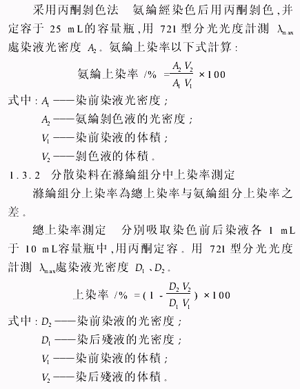分散藍(lán)2B、分散深藍(lán)EX?。樱?、分散翠藍(lán)S?。牵獭⒎稚⒆希龋遥疲?、分散藍(lán)2BLN、分散深藍(lán)HGL、分散藍(lán)SE 2R(以上均為商品染料)。試劑 氫氧化鈉、保險(xiǎn)粉、碳酸鈉、硫酸銨、丙酮(以上均為化學(xué)純)。儀器?。獭。玻矗取。闭袷幦旧珯C(jī)、722型分光光度計(jì)、FA2104S電光分析天平、H?。玻矗茫瓶焖僭嚿珯C(jī)。1﹒2 試驗(yàn)方法1﹒2﹒1 前處理氨綸裸絲用平平加O1g/L,浴比為1︰30,85℃下處理30min,自然晾干﹔滌綸織物用精練劑2g/L,純鹼1g/L,浴比為1︰30,85℃下處理30min,水洗晾干。1﹒2﹒2 染色染色處方/%(owf)分散染料 ?。擦蛩徜@/(g/L)1浴比1︰501﹒3 測(cè)試1﹒3﹒1 分散染料在氨綸組分中上染率的測(cè)定