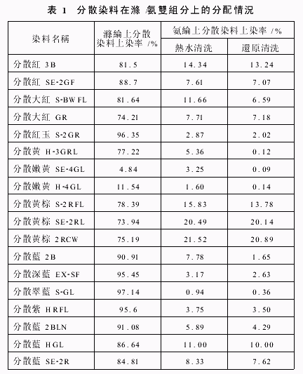 中溫型分散染料分散藍(lán)SE-2R則一直呈上升趨勢(shì)。但是,染色溫度超過(guò)90℃之后,其在滌綸組分中的上染率提升比在氨綸組分中快。從圖3可以發(fā)現(xiàn),分散染料在氨綸與滌綸兩組分上的分配,也隨溫度變化而呈現(xiàn)一定的規(guī)律。低溫階段,分散染料在氨綸上的上染率高于在滌綸上的上染率,三種染料的氨綸上染率之比分別于70℃、90℃和80℃后開(kāi)始回落。當(dāng)溫度達(dá)到130℃時(shí),三種染料在兩種織物的上染分配系數(shù)為0﹒056、0﹒10、0﹒083,均高于氨綸與滌綸雙組分纖維的重量比(5︰95),即一般染色情況下,分散染料對(duì)氨綸組分的上染要高于滌綸組分。2﹒2 分散染料品種與滌/氨上染分配的關(guān)系采用18種常用分散染料,對(duì)滌/氨(95︰5)兩種纖維進(jìn)行染色。室溫開(kāi)始染色,以3℃/min升溫至6120℃,保溫30min。染后分別用熱水清洗或還原清洗,測(cè)定各分散染料在兩組分中的上染率(見(jiàn)表1)。