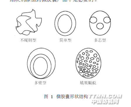 微膠囊的粒徑范圍非常寬,一般為1 ~1 000μm,壁的厚度為0. 5 ~150 μm, 目前已開發(fā)了粒徑在1μm以下的超微膠囊。微膠囊產(chǎn)品的流動性與其壁材的性質關系密切,產(chǎn)品受壓或者產(chǎn)品粒徑范圍過寬,大小顆粒相互嵌合也會降低微膠囊產(chǎn)品的流動性。流動性差往往會影響微膠囊產(chǎn)品的應用,因而選擇適當?shù)目菇Y塊劑添加到微膠囊產(chǎn)品中是必要的。圖1 微膠囊形狀結構2 微膠囊芯材釋放特性微膠囊中的芯材釋放可分為瞬間釋放,緩釋和控制釋放3種情況[ 1 ]。瞬間釋放是用各種形式的外力(如機械壓碎、摩擦)以及使之變形等方法使微膠囊破裂,或在熱的作用下使之熔化,或用化學方法如酶的攻擊,或混入一些膨脹劑到囊芯,或使用電磁方法等使微膠囊破裂,使芯材瞬間釋放到外環(huán)境中。緩釋就是芯材從微膠囊中按一定規(guī)律緩慢釋放,體系中的芯材組分在較長時間內(nèi)可以維持有效濃度。緩釋在織物香味整理中使用得比較多,能延長香味的持續(xù)時間??刂漆尫攀侵敢环N或多種活性成分或配料根據(jù)需要在恰當?shù)臅r間和恰當?shù)奈恢靡砸欢ǖ乃俾蔬M行釋放。微膠囊芯材的控制釋放是指芯材在特定的時間和在特定的作用下釋放出來。3 微膠囊技術在非織造布中的應用微膠囊技術在非織造布中的應用主要利用了微膠囊的3個性能。一是隔離性能,一些具有光敏、熱敏或生物性的材料作為芯材被包埋后,在需要釋放的時候,利用光、熱、壓力及生物作用等手段破壞壁材,即可釋放出材;二是緩釋性能,芯材通過囊壁逐步滲透揮發(fā),延長了作用時間;三是發(fā)泡性能,當微膠囊處于一定溫度下時,芯材溶劑氣化,壁材被膨脹形成一個氣泡,便可達到發(fā)泡的目的,該性能主要用于發(fā)泡印花上。