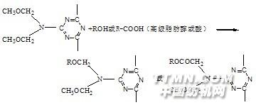 含長(zhǎng)脂肪烴的氨基樹(shù)脂初縮體 這類(lèi)化合物主要是高級(jí)醇或高級(jí)脂肪酸將氨基樹(shù)脂初縮體中的部分羥基進(jìn)行醚化或酯化后的產(chǎn)物。例如:六羥甲基三聚氰胺甲醚與硬酯酸或十八醇反應(yīng),可制得這類(lèi)化合物,反應(yīng)式如下: