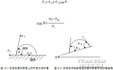 織物的潤濕就是使水或溶液在織物表面迅速展開。一滴液體滴在固體表面上,會受到液體和固體表面張力(分別用σL和σS表示)以及液固間的界面張力(σLS)的作用,當液滴在固體表面處于平衡狀態(tài)時(如圖4-1),這三種力應滿足下列方程: