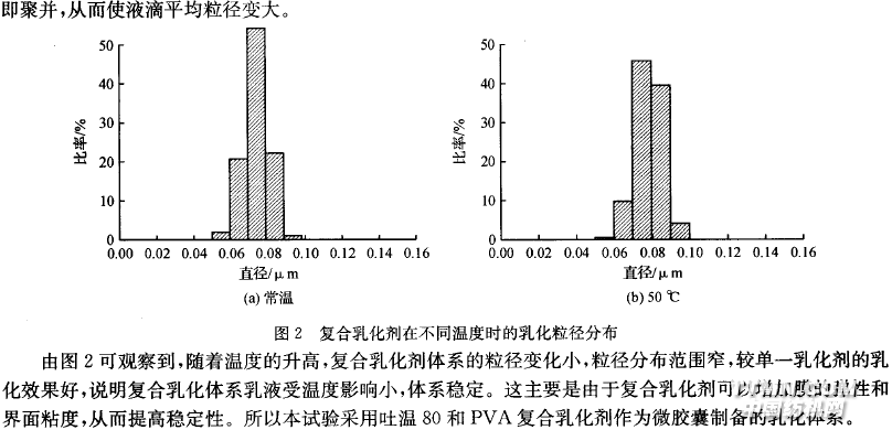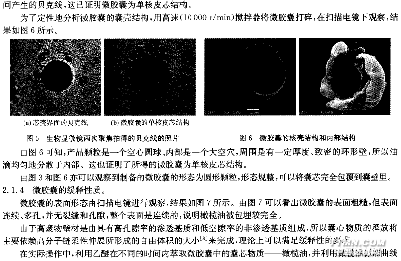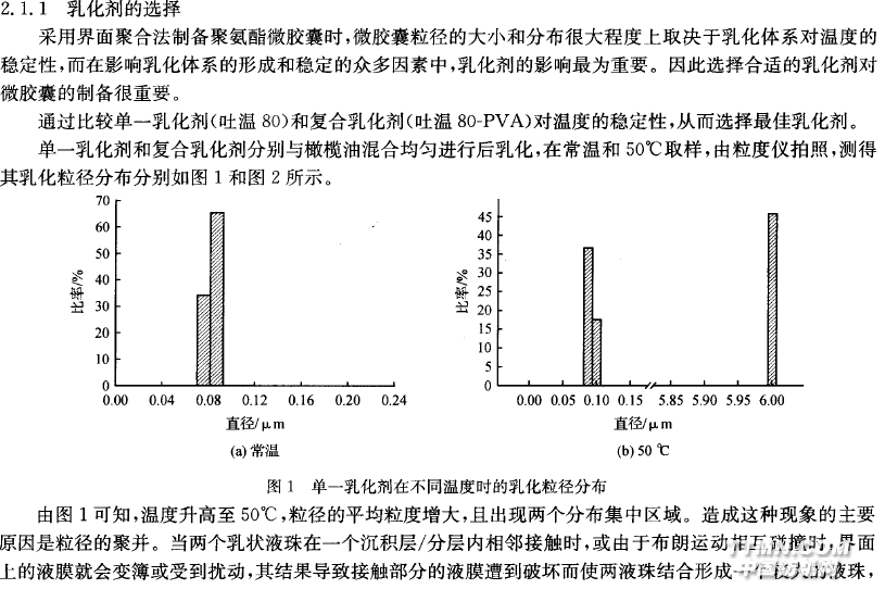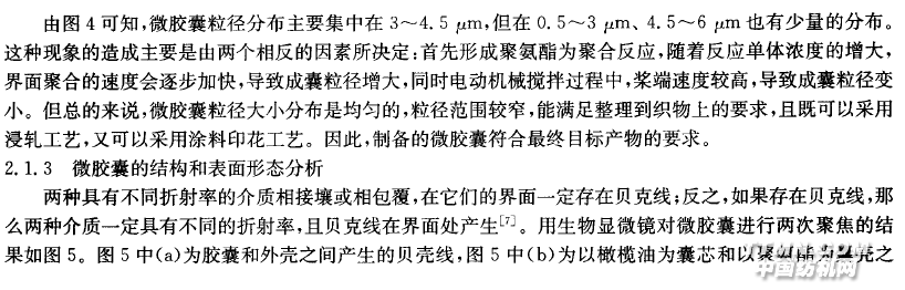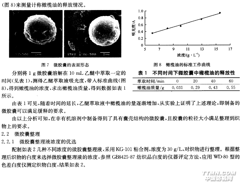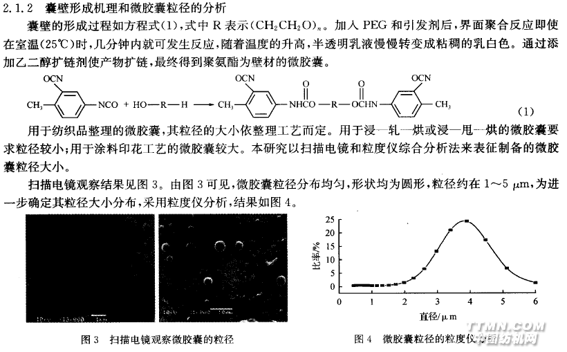 0 引 言微膠囊技術作為一種新興的織物整理技術已得到越來越廣泛的關注。微膠囊制備技術可提高紡織品的附加值,開發(fā)更高檔和多樣化的紡織品,因而具有非常廣闊的前景。目前,紡織品整理用微膠囊的研究多在儲能、芳香、阻燃、防蚊等方面E1 4],在護膚功能方面的報道很少。制備具有護膚功能的微膠囊,并將其整理到紡織品上,可使人們在穿著服裝的同時享受到營養(yǎng)護膚的功能。制備微膠囊時,壁材和芯材的選用都非常重要。聚氨酯由于其多孔性、柔軟性和富有彈性而得到廣泛的應用Es-63;橄欖油是護膚化妝品的重要原料,具有保濕、增加皮膚營養(yǎng)和彈性的功能。目前以聚氨酯為壁材制備的具有護膚功能的微膠囊尚未見報道,且聚氨酯微膠囊的制備多采用有機溶劑作為反應溶劑,對環(huán)保要求日益高標準的今天,這些溶劑的使用顯然受到制約。本論文旨在采用微膠囊制備技術中的界面聚合法制備橄欖油一聚氨酯護膚微膠囊,在不使用有機溶劑的條件下,制備具有護膚功能的微膠囊,并將其用于織物的后整理工藝。1 試驗部分 .1.1 試驗材料與儀器試驗試劑:甲苯二異氰酸酯(TDI)、吐溫8O和乙二醇,均為分析純,聚乙二醇(PEG)600、橄欖油、聚乙烯醇(PVA)3000和三乙烯二胺,均為化學純。試驗儀器:JJ一1精密增力電動攪拌器(金壇市江南儀器廠),FLUKO高速攪拌器(上海弗魯克流體機械制造有限公司),XSP-2XC系列生物顯微鏡(上海光學儀器六廠),LB-550動態(tài)光散射納米粒度分析儀(日本Honba公司),PF-101S集熱式恒溫加熱磁力攪拌器(鞏義市英峪予華儀器廠),JSM25610LV掃描電鏡(日本JEOL),定形烘干機M26。