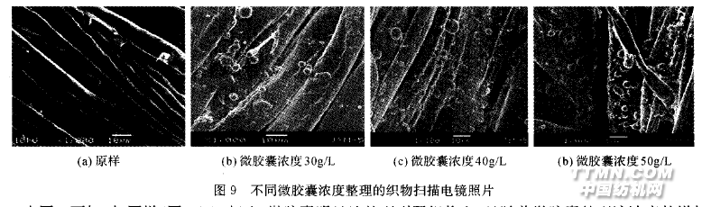 由表2可知,微膠囊的濃度對織物白度影響不是很大,所以再考慮從微膠囊的整理效果來優(yōu)選微膠囊的最佳濃度。由掃面電鏡(如圖9)可以形象地看出,整理后的織物隨著微膠囊整理液濃度的變化,整理效果明顯不同。
