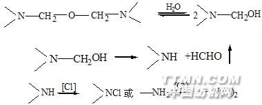 N-羥基甲基化合物整理織物耐洗性與釋放甲醛問題取決于它與纖維素交聯(lián)反應生成物的穩(wěn)定性,實際上是指交聯(lián)生成物對酸,堿水解的穩(wěn)定性。DMEU、DMDHEU及DMPU與纖維素生成的共價交聯(lián),由于氮原子上沒有氫,在堿性介質(zhì)中不能生成酰胺負離子,所以生成交聯(lián)生成物耐堿水洗性很好。但缺點是吸氯,泛黃和氯損。如N-羥基甲基化合物整理的織物,在交聯(lián)生成物的組成中,總含有=NH,—NH2,=N—CH2OH及=N—CH2—O—CH2—N=等基團,這些基團在氯漂過程中會分解、吸氯而生成氯胺,即: