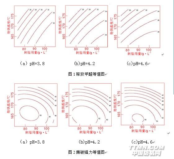 2.4.焙烘溫度的影響 樹脂與纖維素纖維之間的共價交聯(lián)化學反應(yīng)需要在一定溫度條件下才能實現(xiàn)。圖1、圖2中等值線分別顯示,焙烘溫度越高,釋放甲醛量越低,強力保留率越小[7-8]。焙烘溫度大于175℃,共價交聯(lián)反應(yīng)劇烈,撕破強力保留率已小于45%,襯布內(nèi)在質(zhì)量達不到要求。焙烘溫度在170℃左右,共價交聯(lián)反應(yīng)進行得充分,形成的交聯(lián)鍵穩(wěn)定,未交聯(lián)的羥甲基減少,因此釋放甲醛量低于36 mg/kg,撕破強力保留率在50%~52%。焙烘溫度低于1