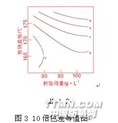 圖3是色差值擴大10倍等值圖,色差表示整理前后染色襯布在顏色知覺上的差異,圖3中色差值都不大于1,色差等級達到4-5級。焙烘溫度對色差有一定影響,圖3中等值線說明,焙烘溫度高,色差大。樹脂與纖維形成共價交聯(lián)同時,樹脂有可能與部分活性染料上亞胺基或羥基發(fā)生共價交聯(lián),改變了染料色光。另外,焙烘溫度太高,不但能耗大,而且棉纖維黃變也加劇[9],色差也必然增大。根據(jù)圖1~3的試驗結(jié)果,在焙烘時間2min條件下,焙烘溫度最終確定為170℃左右。