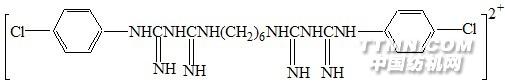脲類和胍類有機衛(wèi)生整理劑 特點是廣譜抗菌,對真菌的抑菌效果好,低毒安全,是很有前途的抗菌劑。 如:3,4,4ˊ-三氯二苯脲;三氟三甲基二苯脲;烷基乙烯脲;1,6-二(4ˊ-氯苯雙胍)己烷等都是很好的抗菌劑,有的可以作為防臭劑。 醫(yī)療方面應用很廣泛的有1,1ˊ-六亞甲基雙 [5-(4-氯苯基)雙胍]鹽酸鹽或葡萄糖酸鹽。結構式如下: