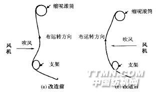 1 研發(fā)解決的技術(shù)難題1.1 縮呢設(shè)備的改進(jìn)和洗縮工藝的調(diào)整1.1.1 設(shè)備改造意大利CIMI公司洗縮聯(lián)合機(jī)(型號(hào):F0TJATEx2C),原風(fēng)機(jī)吹風(fēng)是從前方向后吹(如圖1(a)所示),這種結(jié)構(gòu)布展幅空間小,織物被風(fēng)吹后呈s曲線(xiàn)運(yùn)動(dòng),不易抖開(kāi),易產(chǎn)生縮呢折痕,使成品因嚴(yán)重折痕降等。為了消除織物在縮呢過(guò)程中產(chǎn)生的折痕,對(duì)設(shè)備進(jìn)行了改造。將風(fēng)機(jī)位置移動(dòng),吹風(fēng)方向改為從后向前吹(如圖1(b)所示),這樣布展幅空間大,織物在縮呢過(guò)程中被風(fēng)吹后呈弧線(xiàn)運(yùn)動(dòng),易抖開(kāi),減少縮呢折痕的產(chǎn)生。
