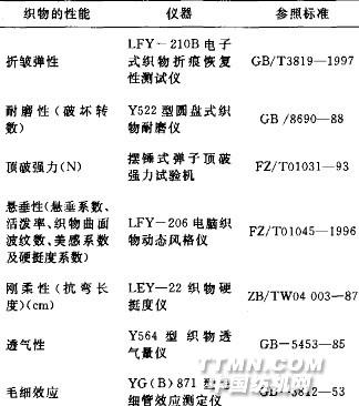 1 實(shí)驗(yàn)1.1 實(shí)驗(yàn)準(zhǔn)備實(shí)驗(yàn)材料:羊毛下腳料,氫氧化鈉,過氧乙酸試劑,粘合劑;棉針織物:組織結(jié)構(gòu)為1+1羅紋,縱密74根/5 cm,橫密56根/5 cm,克重為194 g/m2。整理液的制備:將粘合劑、柔軟劑等與在堿性條件下溶解的羊毛蛋白液按一定比例制成整理液。整理過程:采用浸軋法(二浸二軋)將織物在羊毛蛋白溶液中進(jìn)行整理加工,在100℃ 下烘燥50 min。1.2 測試儀器將經(jīng)過羊毛蛋白溶液整理和未經(jīng)整理的棉針織物性能利用相關(guān)儀器進(jìn)行測試。測試的織物性能指標(biāo)如表1所示。表1 測試的織物性能指標(biāo)