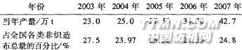 2 針刺法非織造布后整理工藝技術(shù)業(yè)內(nèi)企業(yè)對(duì)于針刺法非織造布后整理技術(shù)已有所了解,但對(duì)整個(gè)工藝設(shè)計(jì)、操作等還是相當(dāng)?shù)哪吧?,做的好的企業(yè)全國(guó)也僅有2~3家。經(jīng)研究,每家企業(yè)的生產(chǎn)工藝均大同小異。整個(gè)技術(shù)流程主要是以下步驟。表1 2003年~2007年針刺法非織造布產(chǎn)量分析