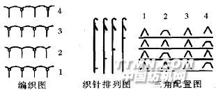 2 產(chǎn)品設(shè)計(jì)2.1 緯平針機(jī)型: 單面圓緯機(jī); 機(jī)號(hào): 28; 筒徑:76.2cm (30in);路數(shù):9O.路;橫密:7O縱行/5cm;縱密:94橫列/5cm;克重:204g/m2。2.2 單面集圈組織2.2.1 機(jī)器條件及上機(jī)工藝參數(shù)機(jī)型:?jiǎn)蚊嫠尼樀泪樋棛C(jī);機(jī)號(hào):26;筒徑:76.2cm (30in);路數(shù):9O路;克重:228g/m2。2.2.2 織物組織設(shè)計(jì)在單面四針道針織機(jī)上通過(guò)配置成圈與集圈相結(jié)合,在織物表面呈現(xiàn)規(guī)則的凹凸小網(wǎng)眼外觀,增大了織物的表面積,可提高織物的散濕能力。圖1織物上機(jī)圖中分別列出了織物的編織圖、織針排列圖和三角排列圖。.jpg)