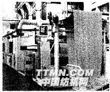 圖27 M5471型針織物定形機工藝流程:平幅進布→螺紋擴幅→紅外對中→下超喂→機械整緯→螺紋擴幅→上超喂→剝邊→上針或上夾(漿邊)→拉幅或熱定形→冷風(fēng)冷卻→切邊、吸邊→脫針或脫夾→擺式落布或打卷設(shè)備主要技術(shù)特征:a. 設(shè)有上、下超喂輥,分別由電機經(jīng)減速器驅(qū)動.根據(jù)不同織物品種要求可進行超喂量的調(diào)整.并顯示其數(shù)字;b. 采用低張力進布架.其中對中糾偏輪為主動.與主機保持良好同步.從而減少對織物產(chǎn)生的張力;c. 紅外探邊自動調(diào)節(jié)裝置.具有較強的抗干擾能力.靈敏度高,調(diào)整范圍寬.幾乎可適應(yīng)織物的各種顏色和厚度;d. 采用落地小循環(huán)積木式烘房,占用空間小.循環(huán)風(fēng)量大,溫度均勻;e. 烘房內(nèi)采用高效節(jié)能的雙風(fēng)道熱循環(huán)系統(tǒng)。上、下噴風(fēng)量可按需要設(shè)定成任何比率.且風(fēng)量大小可變頻控制;f. 特殊的噴嘴排列.不僅噴風(fēng)均勻.而且還可產(chǎn)生氣墊使織物均勻地漂?。椢锸冀K處于松弛狀態(tài);g. 各單元傳動采用變頻專用電機.并帶編碼器反饋的速度閉環(huán)控制系統(tǒng).具有較高的動、穩(wěn)態(tài)過程的同步效果.最大限度地保證織物的低張力運行;h. 采用Profibus-DP數(shù)字通信的PLC控制系統(tǒng).既簡化了控制電路.又保證了控制系統(tǒng)的穩(wěn)定與可靠。