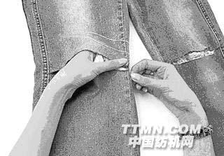 ■材料:舊牛仔褲、白色蕾絲花邊工具:剪刀、針、線 ■步驟一:用剪刀在褲腿膝蓋前片橫向剪開(kāi) ■步驟二:把剪成同等大小的蕾絲花邊與剪開(kāi)處縫合