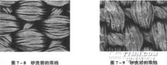 蠶絲含有大量的羥基、酸基和氨基等親水性基團(tuán),在水和化學(xué)砂洗劑的作用下劇烈溶脹,楊氏模量和強(qiáng)力下降;經(jīng)反復(fù)的機(jī)械摩擦作用,蠶絲表面的部分絲膠IV被除去,絲素表面的巨原纖或原纖結(jié)構(gòu)因分子鏈降解而部分?jǐn)嗔?、帚化,在纖維表面形成微絨 繼續(xù)用轉(zhuǎn)籠式烘燥機(jī)在冷風(fēng)中繼續(xù)磨打織物,使織物不斷經(jīng)受摩擦和揉搓,顯現(xiàn)出纖維的潛在損傷,使織物表面的絨毛完全挺起,獲得桃皮狀絨毛