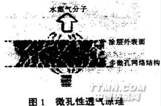 1、織物的防水透氣機(jī)理 可分物理透濕和功能透濕,主要有以下4種方式。1.1、利用水滴的最小直徑與水汽或空氣的直徑之間的差異來實(shí)現(xiàn),即采用織物的經(jīng)緯交織間的孔隙或織物復(fù)合物的孔徑介于水滴最小直徑與水汽或空氣的直徑之間,達(dá)到防水透氣的目的?;谶@一原理設(shè)計(jì)的防水透氣的織物有超細(xì)高密織物、特高密度的棉織物等。這類織物的透濕類型屬于紗線間孔隙的自然擴(kuò)散。高密織物由于輕薄耐用,透濕性好,柔軟,懸垂性好,防風(fēng),廣泛用于體育、戶外活動(dòng)服裝上。主要缺點(diǎn)是防水性差,由于織物密度大,織物的撕裂性能差,紡紗必須特殊處理,生產(chǎn)成本高,加工困難。1.2、采用微孔高聚物薄膜,使薄膜微孔(微孔直徑大約lnm)的孔徑介于水滴與濕氣之間,將薄膜與織物復(fù)合賦予織物防水透氣功能,如圖1。