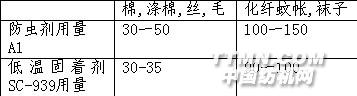 化料操作:(以配制500升溶液為例)首先在化料桶內(nèi)加入300-400升水,開動(dòng)攪拌器,加入防蟲整理劑A1,然后加入低溫固著劑SC-L,加水至500升,繼續(xù)攪拌。