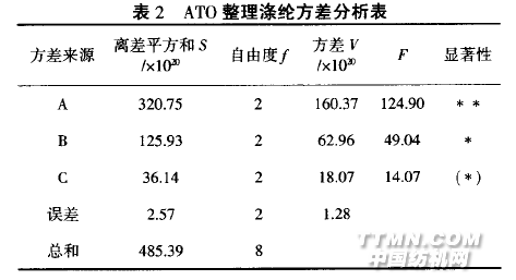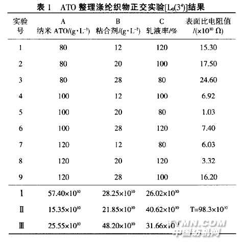 由表1及表2可知,納米ATO粉體質(zhì)量濃度對(duì)整理織物表面比電阻值的影響特別顯著,粘合劑質(zhì)量濃度影響顯著,軋液率影響較顯著,其優(yōu)化方案是A2B2C1,即納米ATO 100g/L,粘合劑20g/L,軋液率120%。考慮到實(shí)際操作中滌綸織物軋液率不易達(dá)到120%,故軋液率取100%,則優(yōu)化方案是A2B2C2。對(duì)最優(yōu)工藝進(jìn)行驗(yàn)證,測(cè)得整理織物的表面比電阻值為9.28x109Ω,小于正交實(shí)驗(yàn)最小的表面比電阻值1.03x1010Ω。