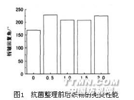 (1) 一浴法 二浸二軋( 80℃×30 min,軋余率80% ) →預(yù)烘(80℃×5 min)→焙烘(160℃×3 min)究其在棉織物上的抗菌效果。