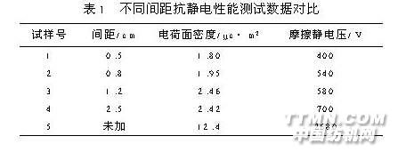的產(chǎn)品。利用該方法開(kāi)發(fā)的產(chǎn)品的抗靜電性能與加入的碳黑復(fù)合有機(jī)導(dǎo)電長(zhǎng)絲在織物中的間距有關(guān)。在同一毛滌混紡織物(如羊毛含量45%,滌綸含量55%)中,按不同的間距以嵌線形式加入碳黑復(fù)合有機(jī)導(dǎo)電長(zhǎng)絲,進(jìn)行抗靜電性能測(cè)試,測(cè)試結(jié)果見(jiàn)表1。